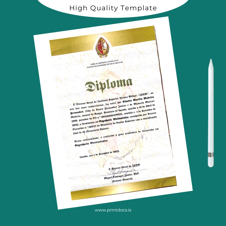Don’t let lost or damaged diplomas hinder your career progression. Invest in the Angola Instituto Superior Técnico Militar Bachelor of Science in Electrical Engineering Template (Word & PDF) for an editable and print-ready solution. Customize your diploma easily and present your academic achievements professionally. Download now to secure your fully personalized and quality diploma certificate.
