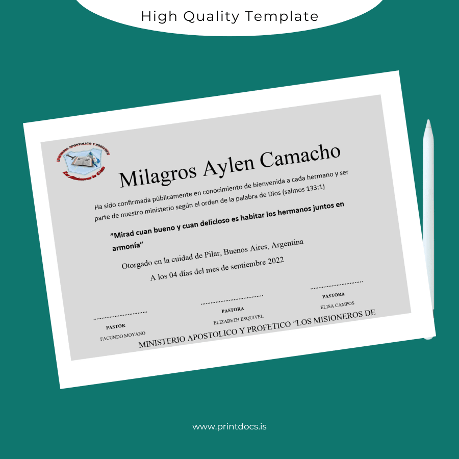 Discover the convenience and professionalism of the Argentina Apostolic and Prophetic Ministry _Los Misioneros de Cristo_ Welcome Diploma Template (Word & PDF). This customizable degree template is designed for ministry organizations, educators, and administrators seeking a reliable and elegant solution to generate official diplomas effortlessly. Whether you need to create a replacement diploma or produce a blank diploma form for events, this digital diploma download ensures a seamless experience from editing to printing.