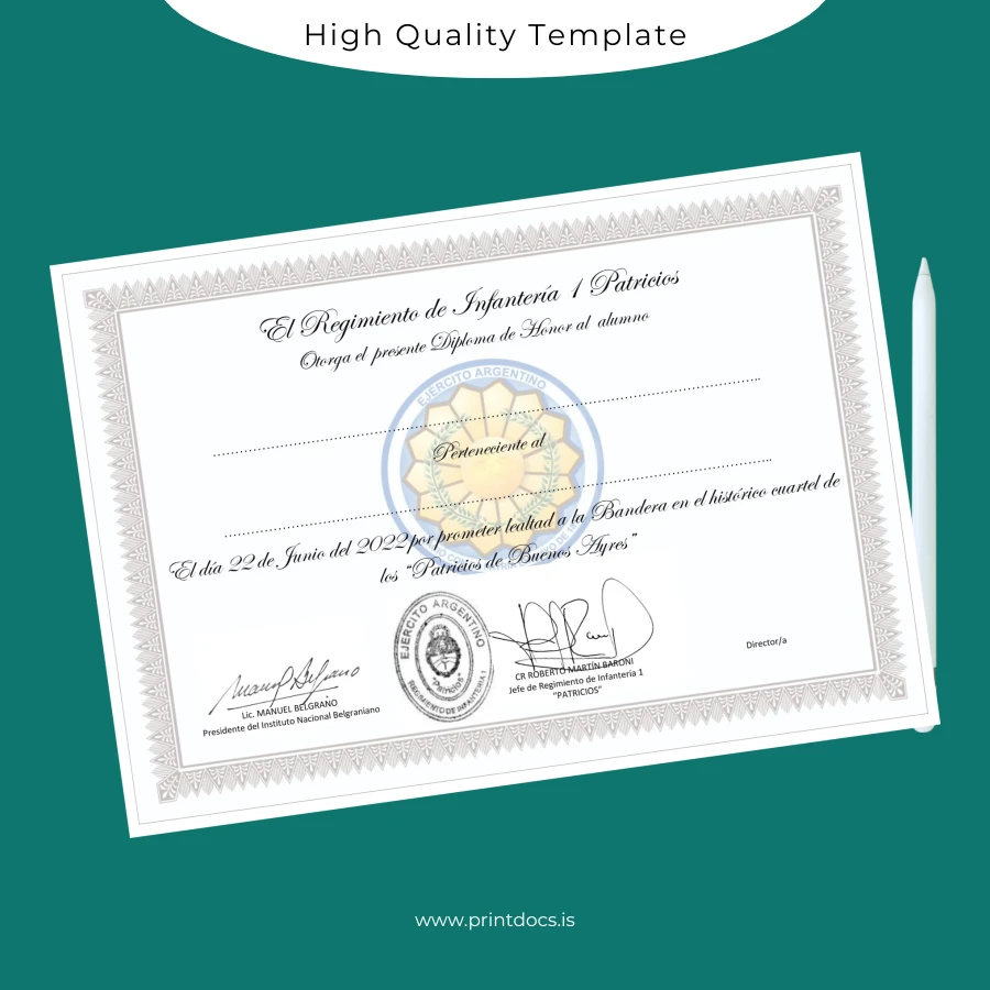 Editable Argentina Regimiento de Infantería 1 Patricios Honor Diploma Template (Word & PDF)
