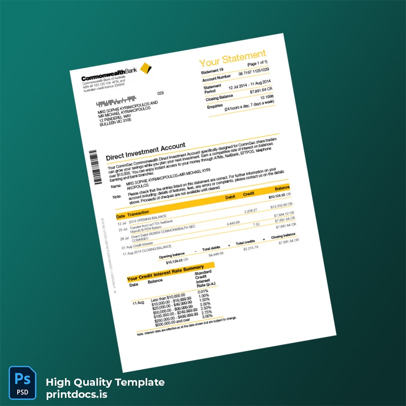 Need a reliable way to obtain an editable bank statement for personal or business use? Our Australia Commonwealth Bank Statement Template is designed to cater to professionals who require immediate access to their banking documentation, whether due to loss, theft, or expiration.