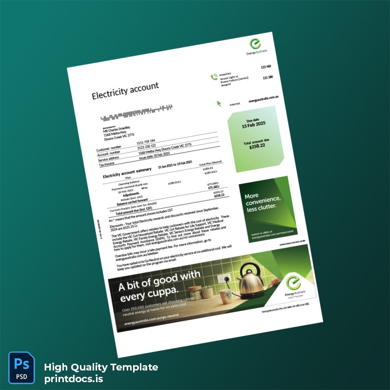 The Australia EnergyAustralia Editable Utility Bill Template provides a reliable solution for professionals needing a fast, customizable, and legally convincing proof of address document. Available in both Word and PDF formats, this template caters to users requiring an editable utility bill template for various official and personal applications.