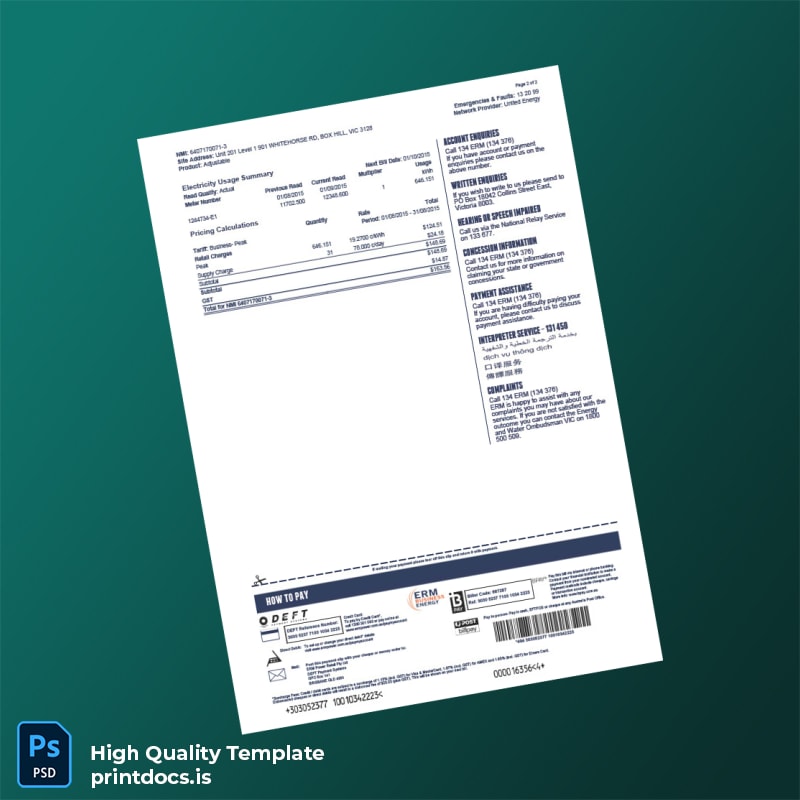 Effortlessly create a professional and verifiable electricity bill proof of address with the Australia ERM Power Retail Pty Ltd Editable Electricity Bill Template. Designed for seamless customization in both Word and PDF formats, this utility bill template ensures you have a reliable document ready whenever you need it.