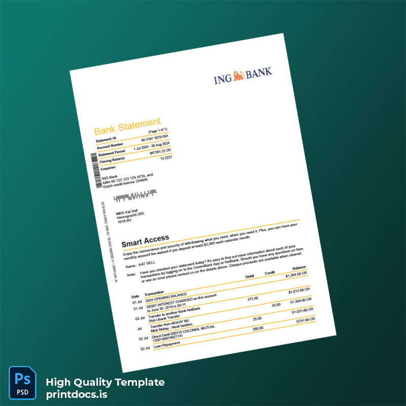Your search for a reliable and professional bank statement template ends here. The Australia ING Bank Statement Template, available in both Word and PDF formats, is designed for those who need a quick and efficient solution for creating editable bank statements.