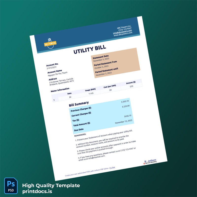 Australia Jotform Editable Utility Bill Template in Word and PDF Formats