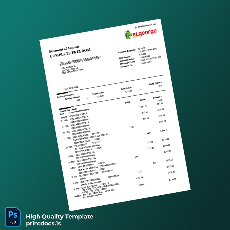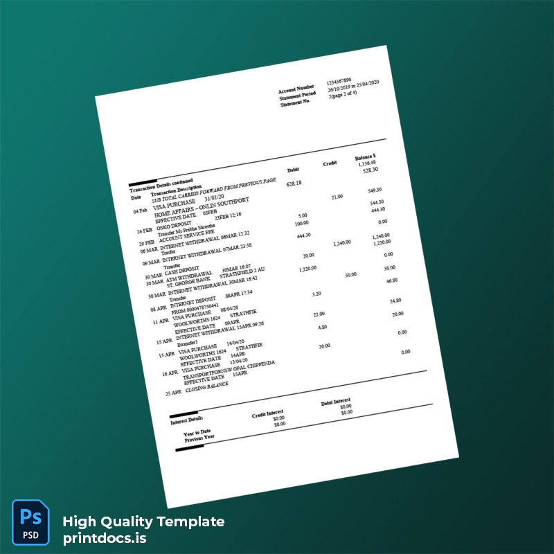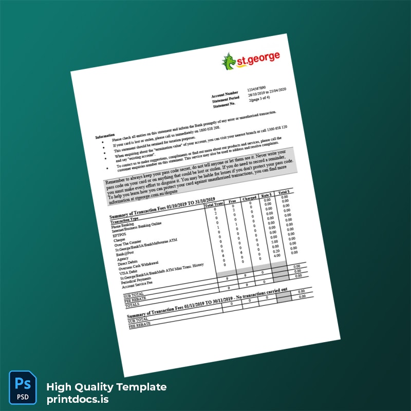 Looking for a reliable solution to create a professional quality bank statement quickly? The Australia St George Bank Statement Template is designed for professionals like you who need an editable, accurate banking document in both Word and PDF formats.