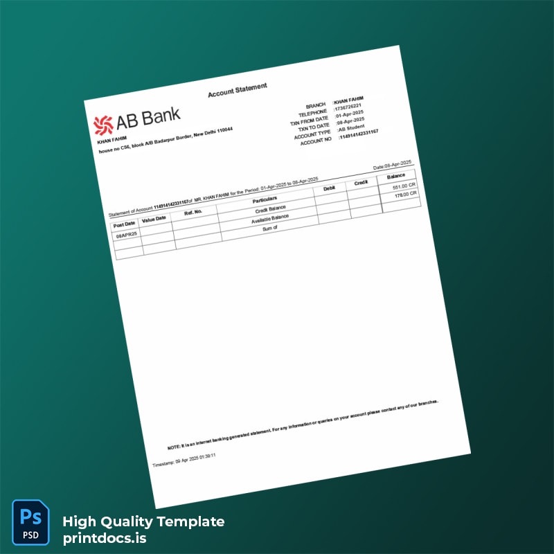 The Bangladesh AB Bank Statement Template in both Word and PDF formats is expertly designed for professionals who need a quick and reliable solution to produce high-quality bank statements. Whether you’ve misplaced an important document or require an updated version for a loan application, this editable bank statement template streamlines the process, allowing you to tailor every detail effortlessly.
