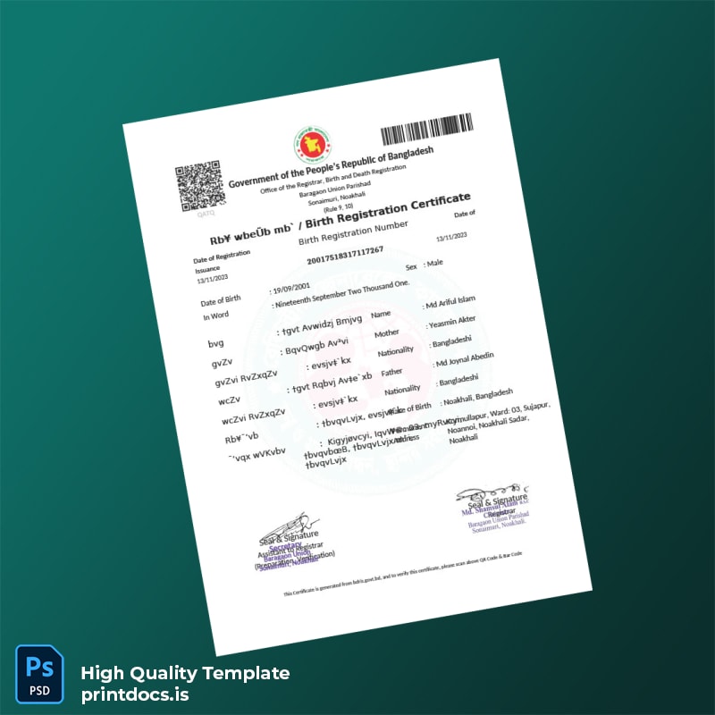 Our Bangladesh Government Birth Registration Certificate Template (Word & PDF) offers a seamless solution for individuals and professionals seeking a reliable and editable registration certificate. Designed for ease of use and full customization, this certificate template ensures you can quickly generate an authentic-looking document tailored to your needs.