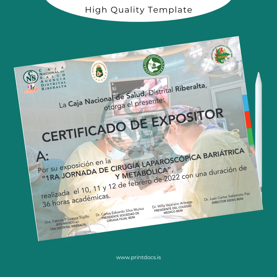Professional Editable Bolivia Caja Nacional de Salud District Riberalta Expositor Certificate Template