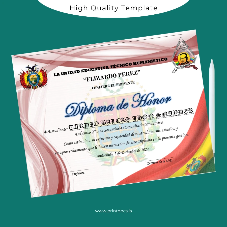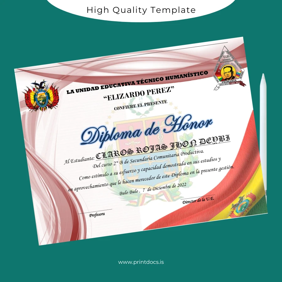 Discover the perfect solution for creating professional diplomas with ease using the Bolivia Elizardo Pérez Technical Humanistic Educational Unit Diploma Template, available in Word and PDF formats. This editable diploma template allows you to customize every detail, ensuring a flawless and authentic-looking certification for any academic achievement.