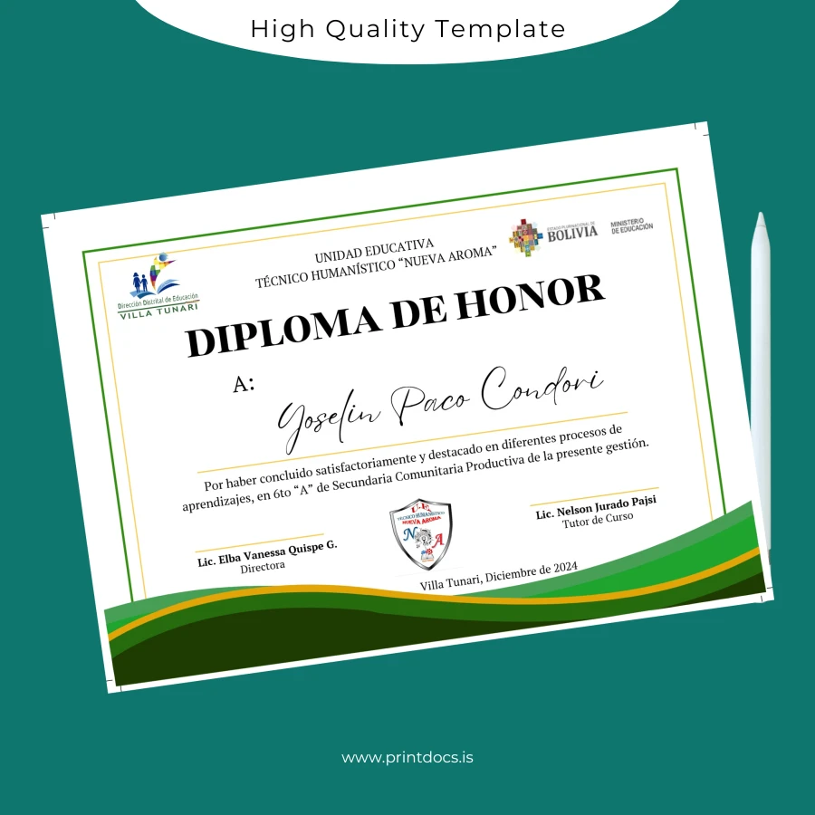 Meet the Bolivia Unidad Educativa Técnica Humanística Nueva Aroma Diploma de Honor Template (Word & PDF), a meticulously designed editable diploma template tailored for educators, administrators, and institutions requiring a seamless solution to produce high-quality, customizable degree certificates. Whether you are replacing a lost diploma or crafting new academic recognitions, this digital diploma download offers unmatched versatility and professionalism.