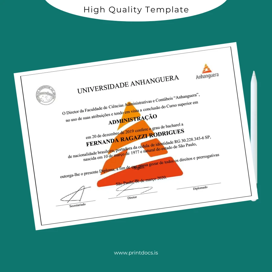 Be the first to review “Brazil Anhanguera University Bachelor of Administration Degree Certificate Template Word & PDF 2 Page”