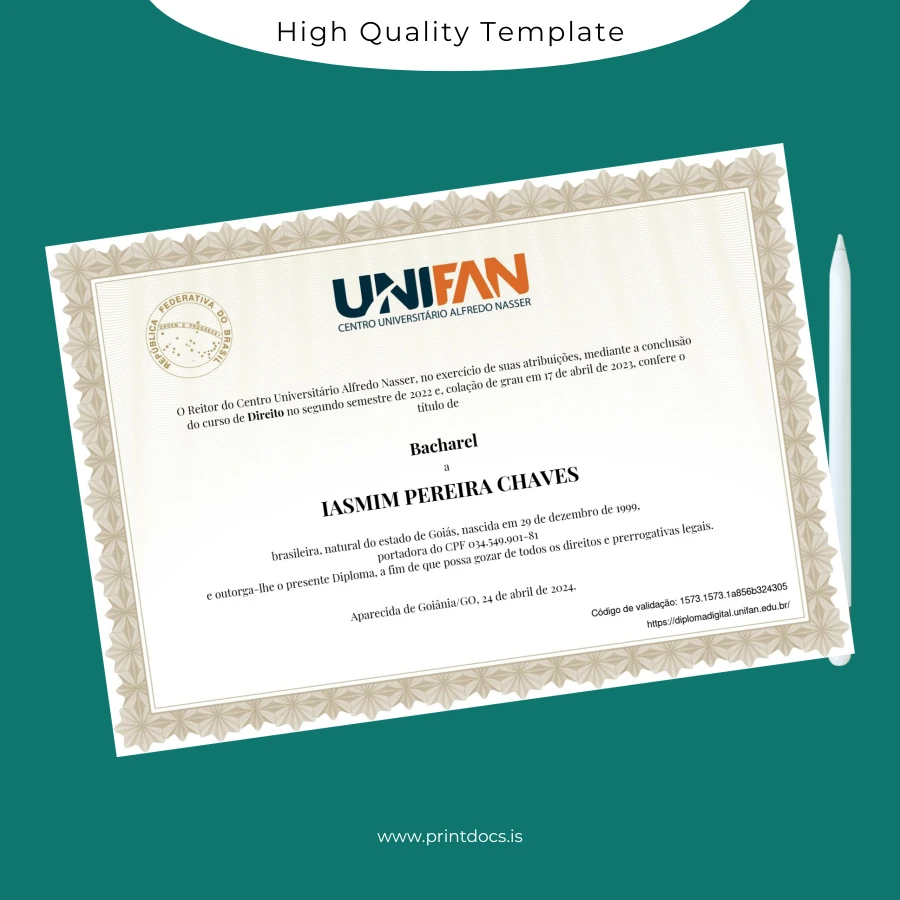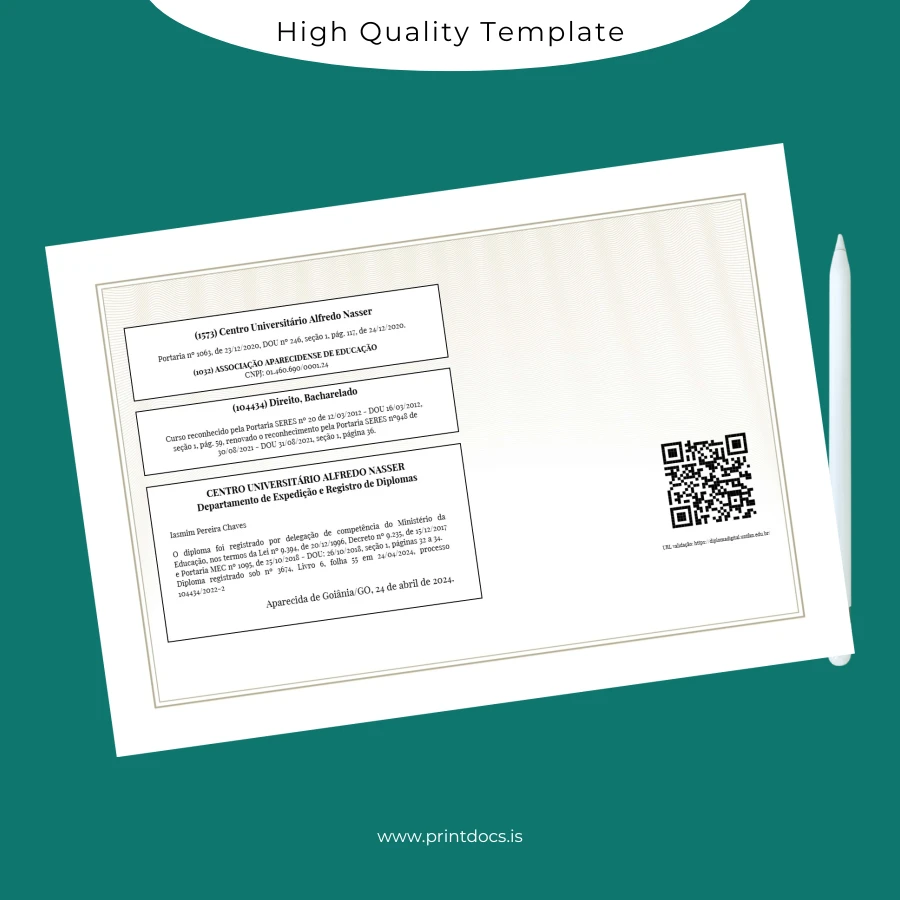 Discover a professional and fully editable diploma template designed specifically for the Brazil Centro Universitário Alfredo Nasser Bachelor of Laws qualification. This digital download offers an easy yet sophisticated way to create a replacement diploma or a customizable degree template tailored to your needs.