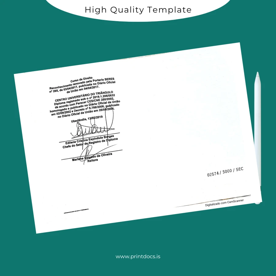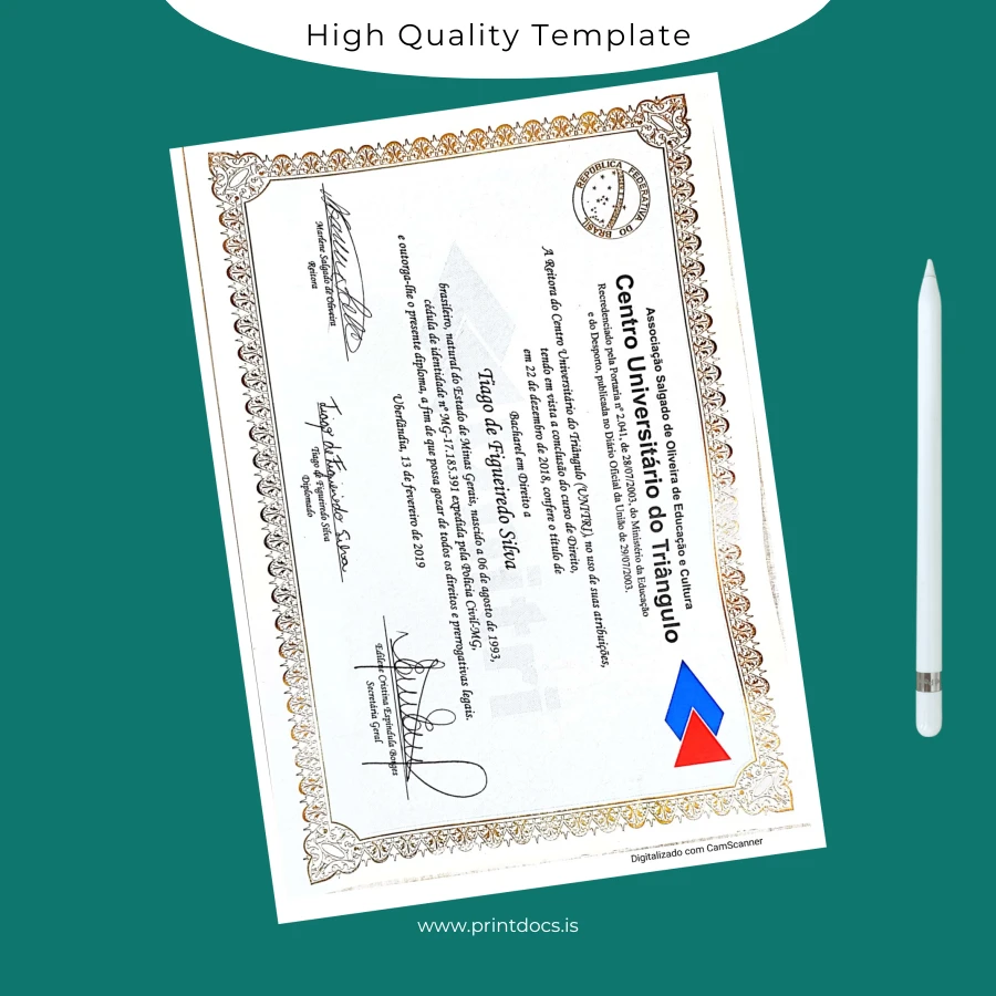 Discover the perfect solution for professionals seeking a high-quality, customizable diploma template designed specifically for the Brazil Centro Universitário do Triângulo Bachelor of Law degree. This template provides a seamless experience for users needing to replace or replicate their diploma with accuracy and ease. Whether you have lost your original document, need a rapid replacement, or simply require a digital version for presentation, this editable diploma template offers a reliable and user-friendly option.
