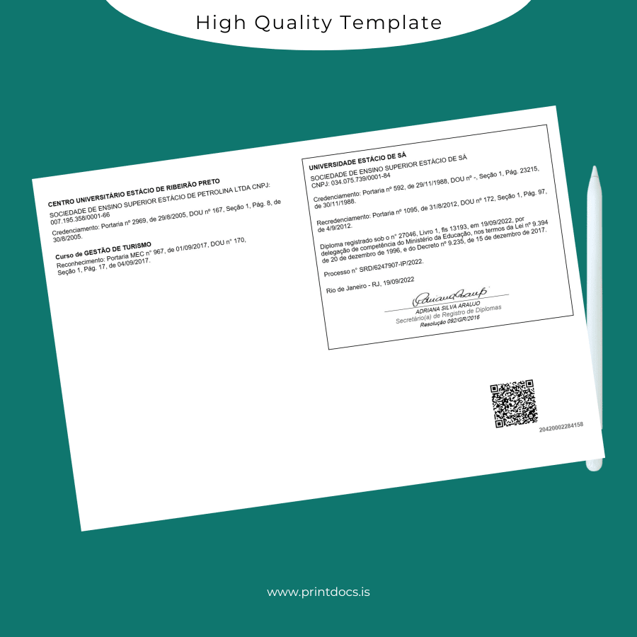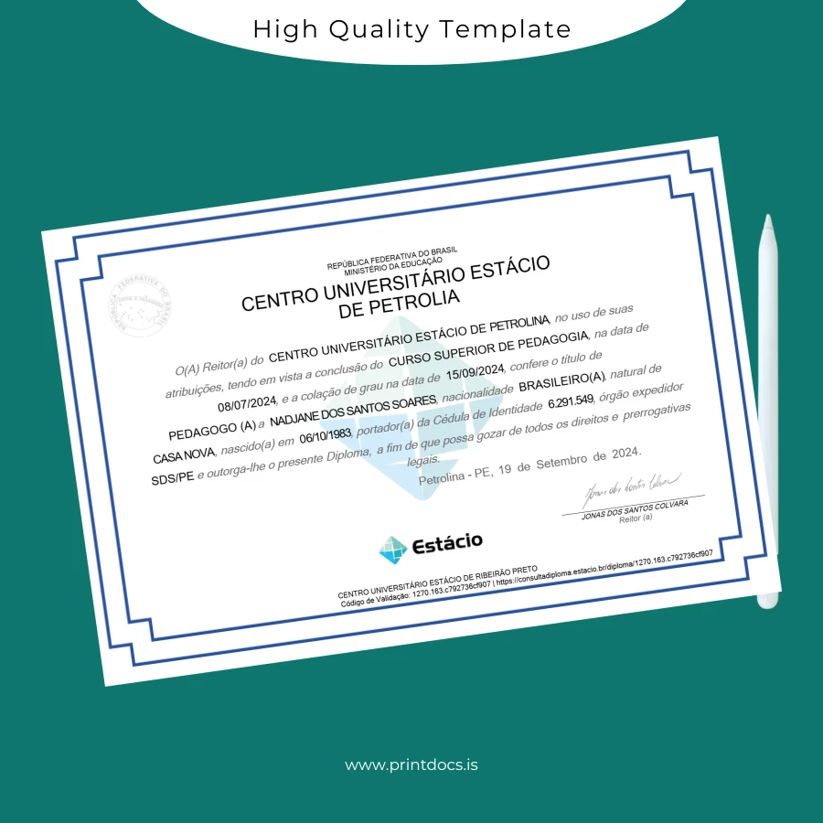 Professional and Editable Diploma Template for Brazil Centro Universitário Estácio de Petrolina Bachelor of Education in Pedagogy