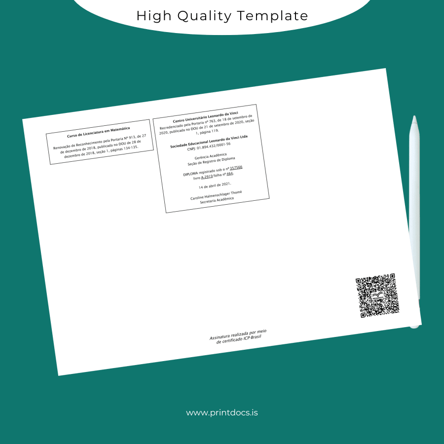 Discover the ultimate solution for professionals needing a precise, editable diploma certificate with the Brazil Centro Universitário Leonardo da Vinci Bachelor of Arts in Mathematics Template. This customizable and printable template offers unmatched flexibility and quality, enabling you to quickly replace lost or damaged diplomas with ease and professionalism.