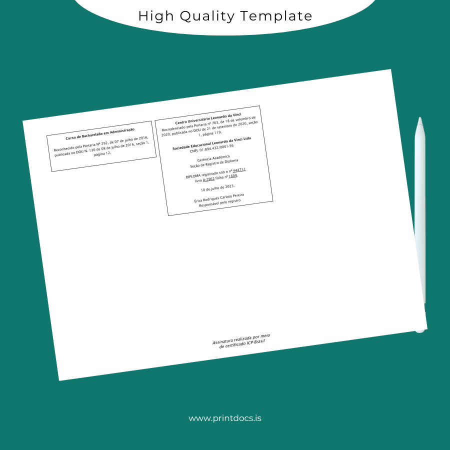 Designed specifically for graduates of Brazil Centro Universitário Leonardo da Vinci, this Bachelor of Business Administration diploma template offers a seamless way to create a polished and official-looking document. Whether you need a replacement diploma, a customizable degree template for display, or a blank diploma form to personalize, this digital download meets professional standards and printing requirements.