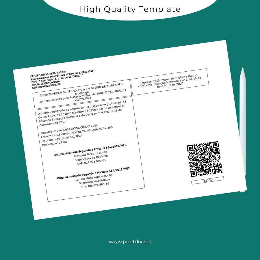 Discover the Brazil Centro Universitário UNA Technology in Interior Design Diploma Template (Word & PDF), designed for professionals who need a seamless, customizable solution to create or replace academic credentials quickly and with high quality. Whether you’ve misplaced your original diploma or require a polished replacement, this digital diploma download offers both convenience and professional results.