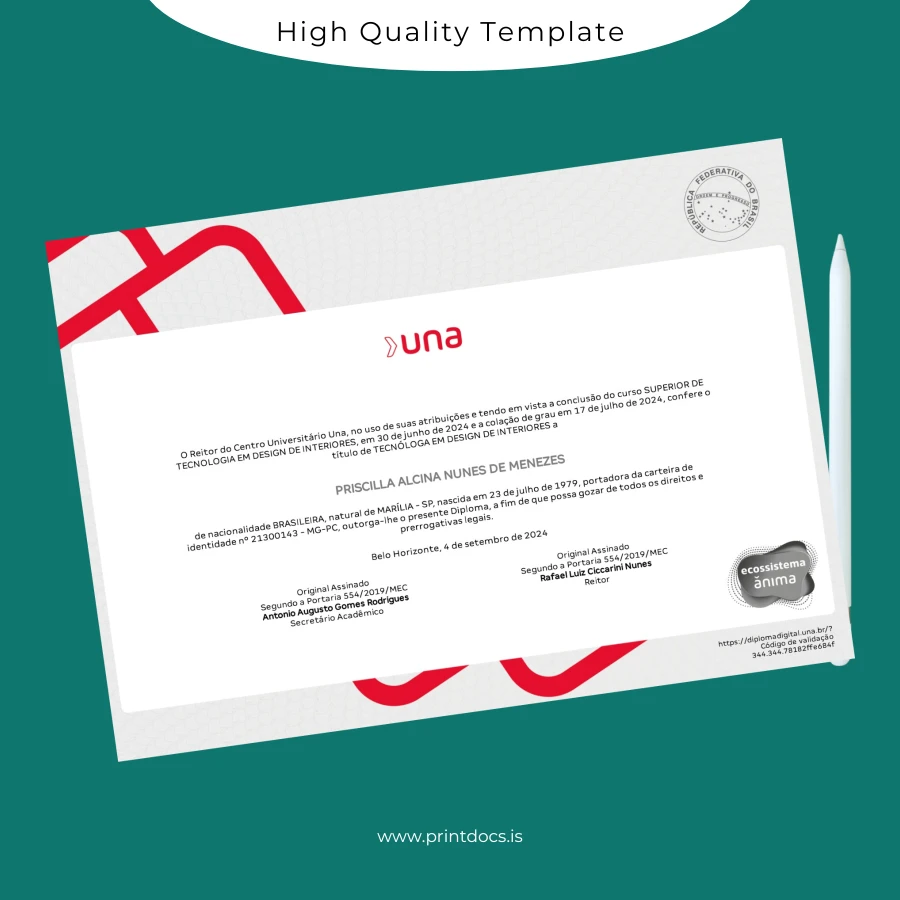 Brazil Centro Universitário UNA Technology in Interior Design Diploma Template (Word & PDF) – Editable & Printable 2 Page