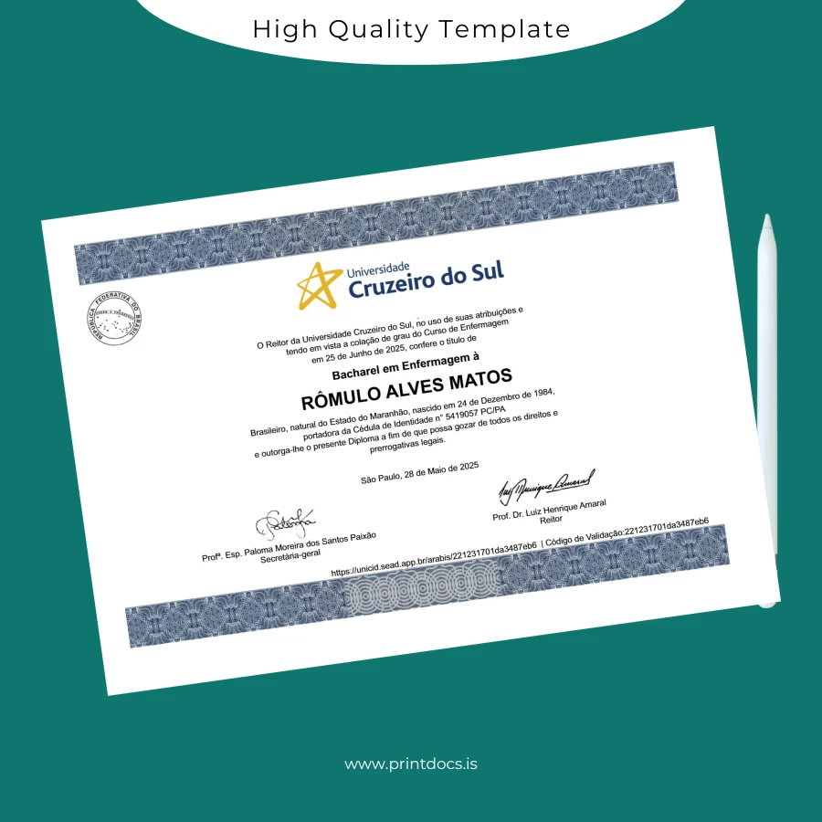 Editable & printable Brazil Cruzerio do Sul University Bachelor of Nursing Diploma Template (Word & PDF) for fast, professional replacement diplomas.