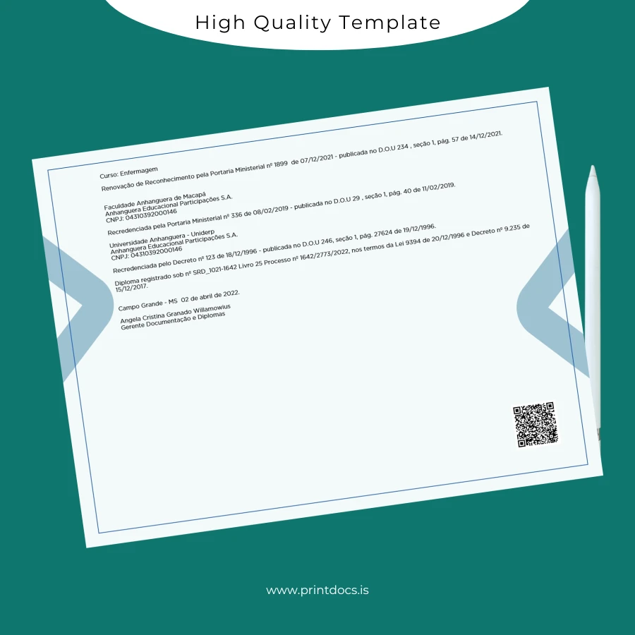 Don’t let missing credentials hold you back. With this editable and printable diploma template, you regain control over your academic proof with minimal effort. Download now to customize your Brazil Faculdade Anhanguera de Macapá Nursing Diploma Template (Word & PDF) and print a professional document that meets your career requirements.