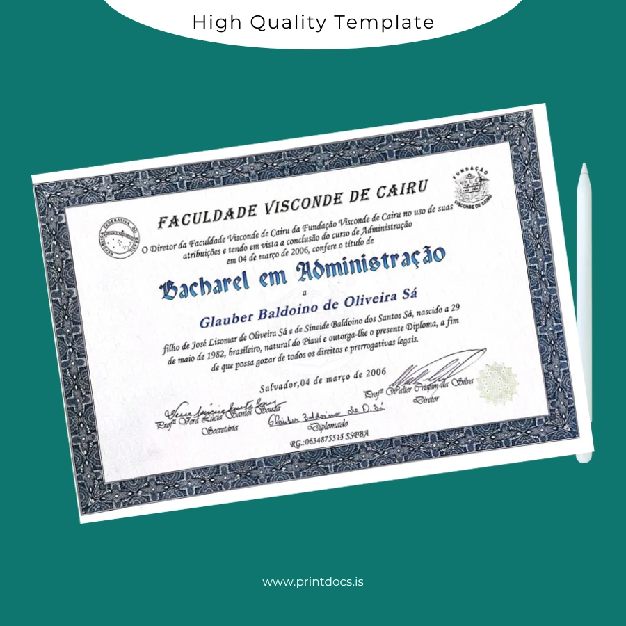 Take control of your academic document needs with this versatile, editable diploma template. By selecting this professionally crafted Bachelor of Business Administration template from Brazil Faculdade Visconde de Cairu, you ensure an authentic appearance paired with straightforward editing and printing. Don’t let document issues hold you back; download your editable diploma template now and create a flawless, professional document with confidence.