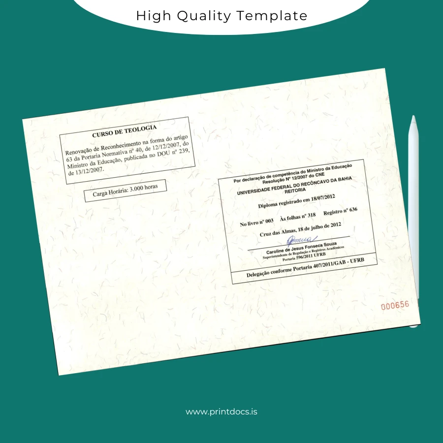 Discover the convenience of the Brazil Federal University of Bahia Bachelor of Theology Template (Word & PDF), designed for professionals who need a reliable and customizable diploma solution. This template offers an easy way to create a polished, official-looking degree certificate that meets academic standards with minimal effort.