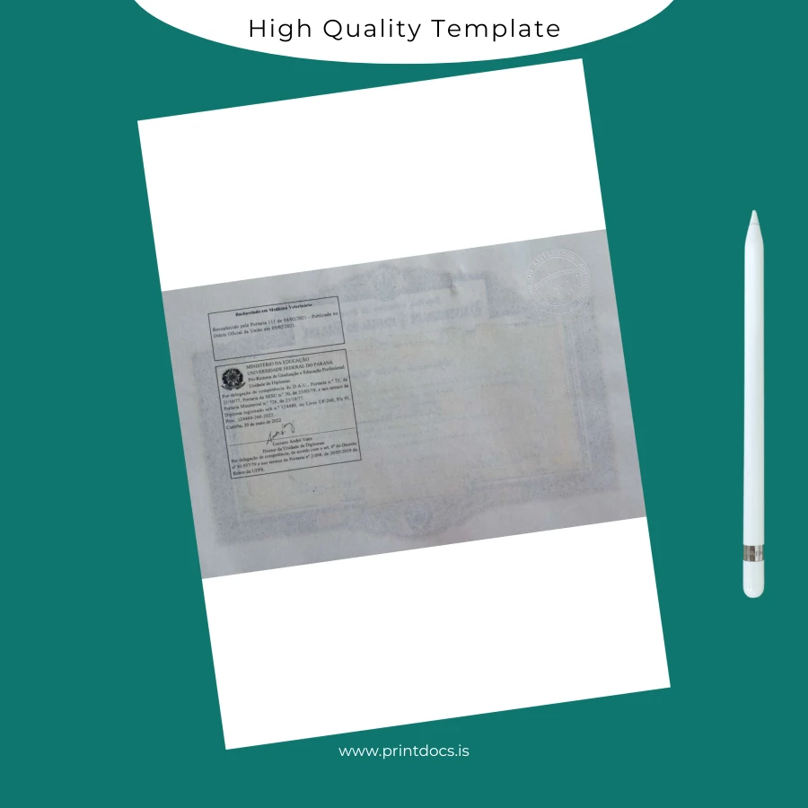 The Brazil Federal University of Paraná Veterinary Medicine Diploma Template (Word & PDF) offers a seamless solution for professionals who need a high-quality, editable certificate. Whether for a replacement diploma or a customizable degree document, this template empowers users to easily personalize and print a flawless official replica quickly and efficiently.