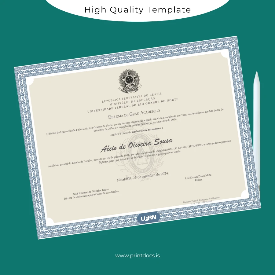 Editable and printable Brazil Federal University of Rio Grande do Norte Bachelor in Journalism Template (Word & PDF) for quick, professional diploma replacement.