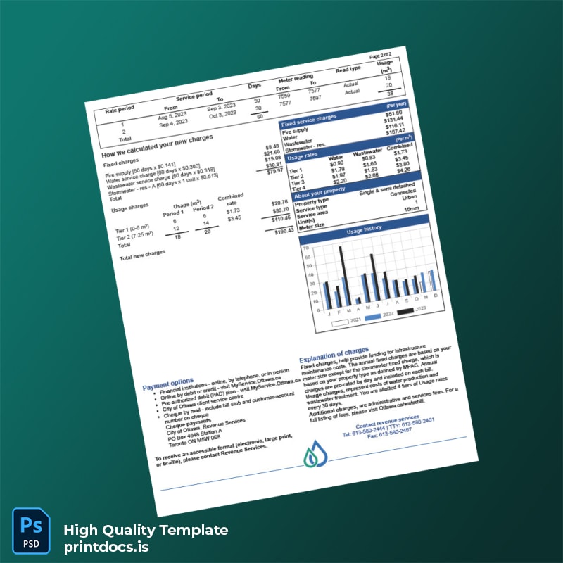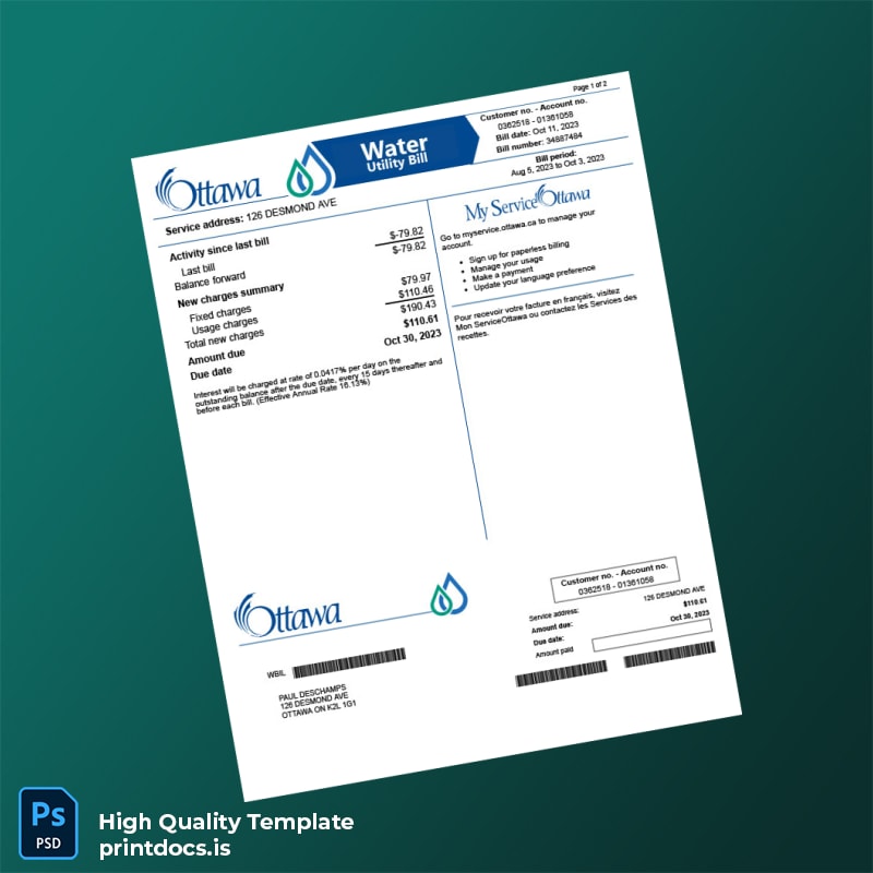 Canada City Of Ottawa Editable Water Bill Template in Word and PDF Formats