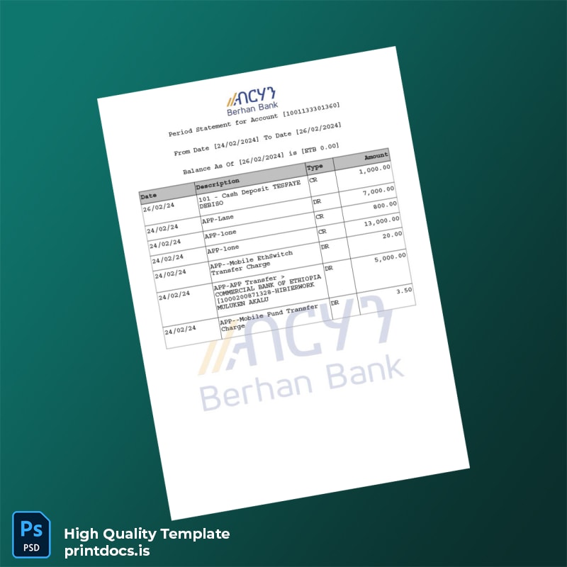 Ethiopia Berhan Bank Statement Template