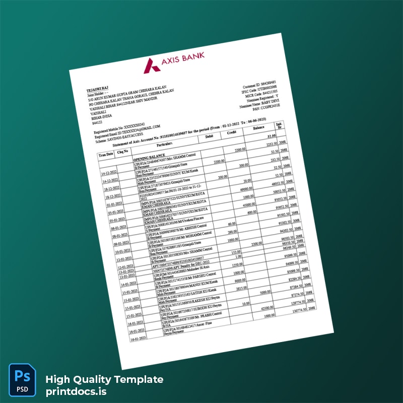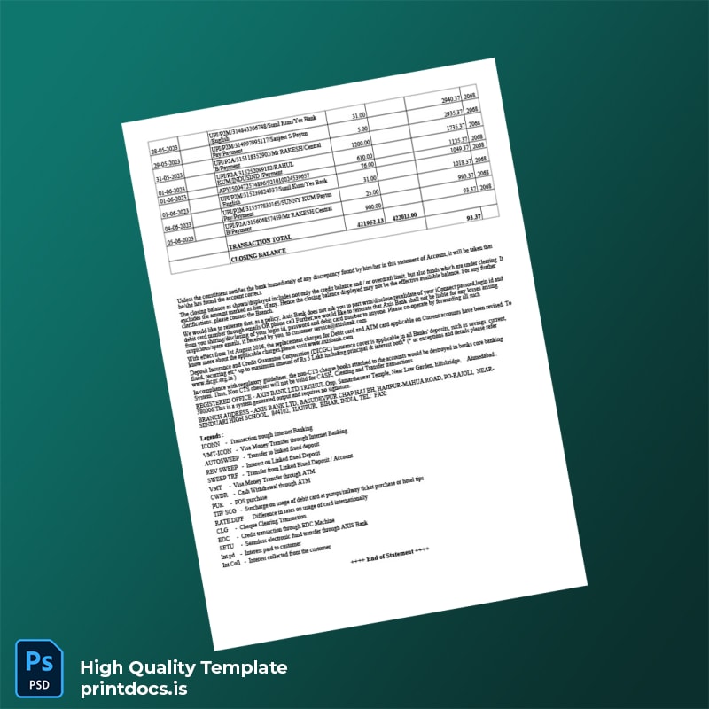 Are you in urgent need of a professional bank statement but facing the challenge of obtaining accurate documentation? Our India Axis Bank Bank Statement Template is precisely what you need to address those immediate requirements seamlessly.