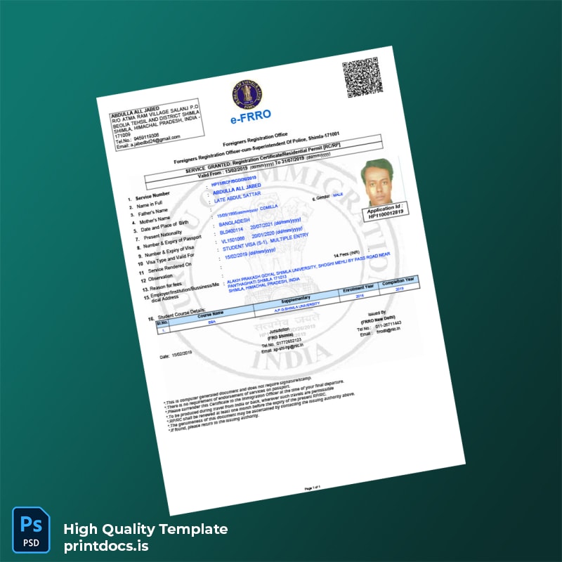 India Foreigners Registration Office Registration Certificate Template (Word & PDF)