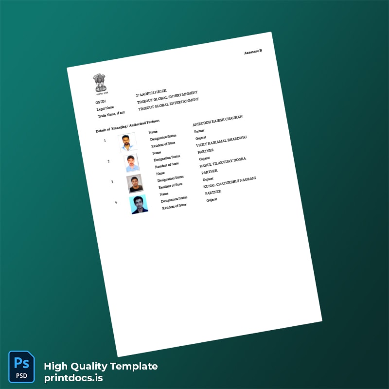 Ensure your business registration process is seamless and professional using our expertly designed India Government GST Registration Certificate Template. This editable certificate template caters to business owners, accountants, and legal professionals who require a reliable and easy-to-use tool for preparing official documents. Whether you need a quick replacement or are setting up your company documentation, this template ensures accuracy and compliance with government standards.