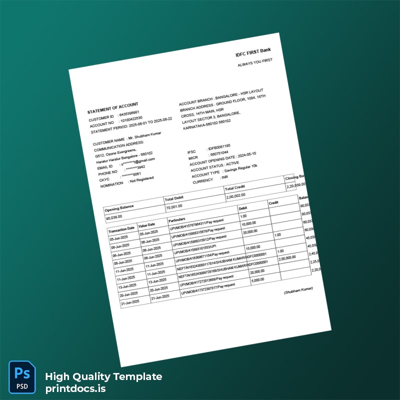 Transform Your Professional Needs with the India IDFC FIRST Bank Statement Template