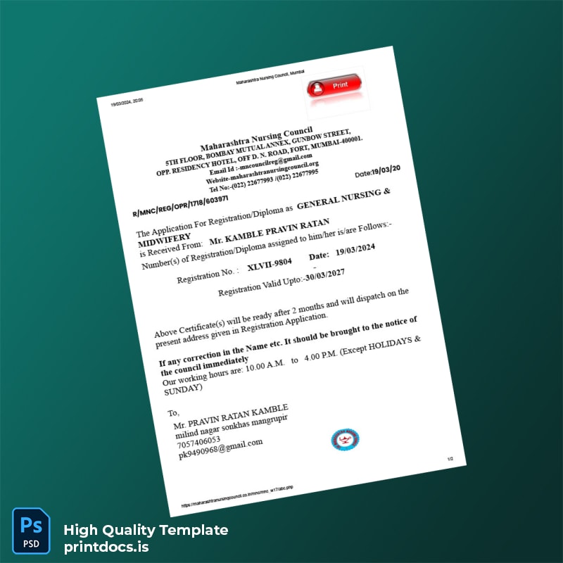 Effortlessly create and maintain your crucial nursing council registration credentials with our meticulously crafted India Maharashtra Nursing Council Registration Certificate Template (Word & PDF). Designed for healthcare professionals and administrative staff, this editable registration certificate package ensures accuracy, compliance, and quick accessibility.
