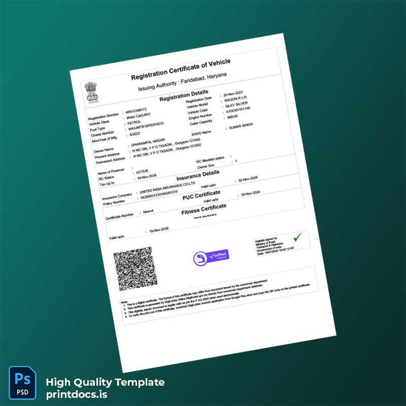 India Ministry of Road Transport and Highways Registration Certificate Template (Word & PDF)