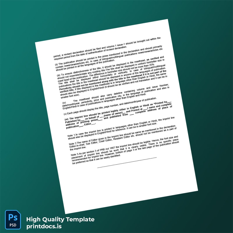 Unlock hassle-free documentation with the India RNI Registration Certificate Template (Word & PDF), designed to simplify and accelerate the process of obtaining your official registration certificate. Ideal for entrepreneurs, small business owners, and legal professionals, this editable certificate template offers a professional solution that saves time and ensures accuracy.