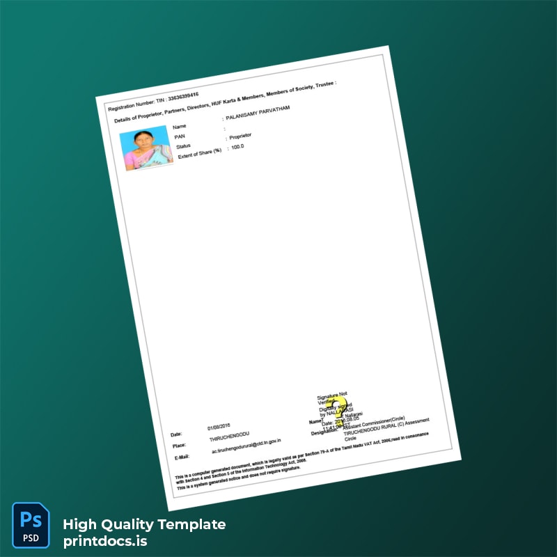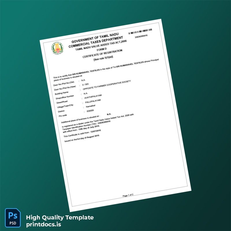 India Tamil Nadu Commercial Registration Certificate Template (Word & PDF) 2 page