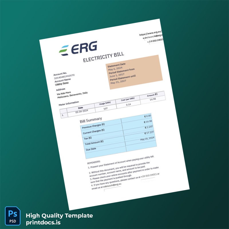 Ensure your professional documentation is always ready. Purchase the Italy ERG Editable Electricity Bill Template now and experience the efficiency of a dependable, editable utility bill template crafted for your needs.