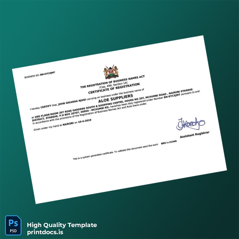 Professional Kenya Assistant Registrar Business Registration Certificate Template