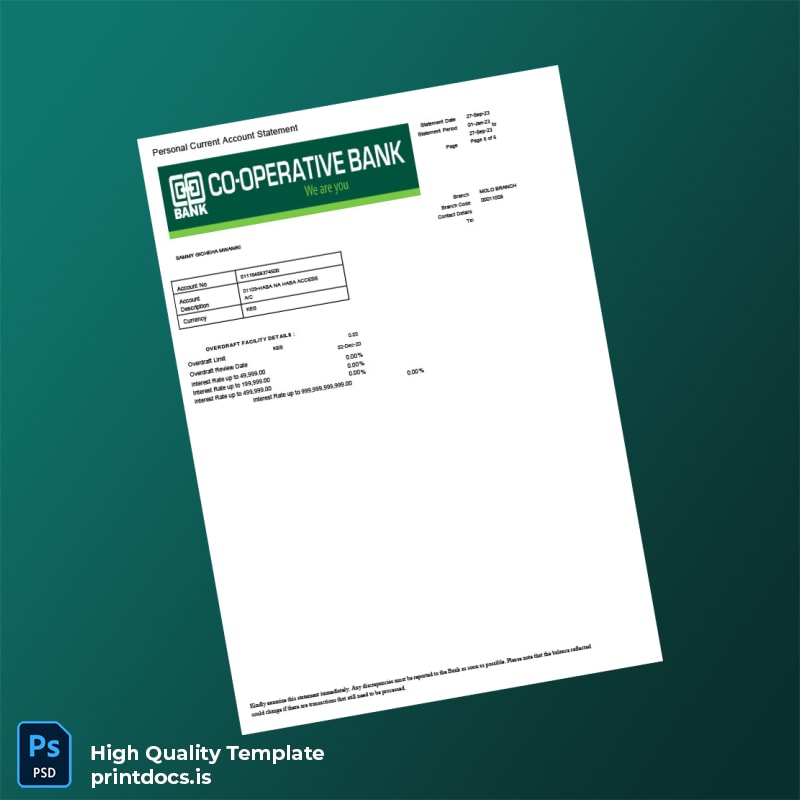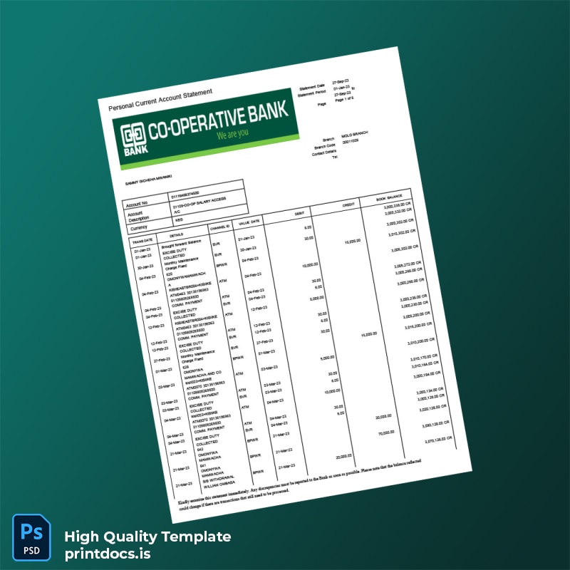 Kenya Co-Operative Bank Bank Statement Template in Word and PDF formats 6 page
