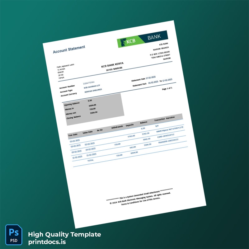 Kenya KCB Bank Account Statement Template in Word and PDF formats