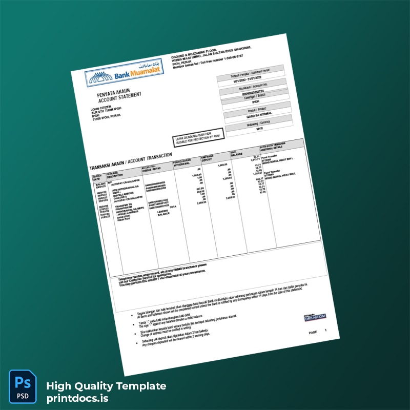 Malaysia Meamulat Bank Statement Template in Word and PDF formats