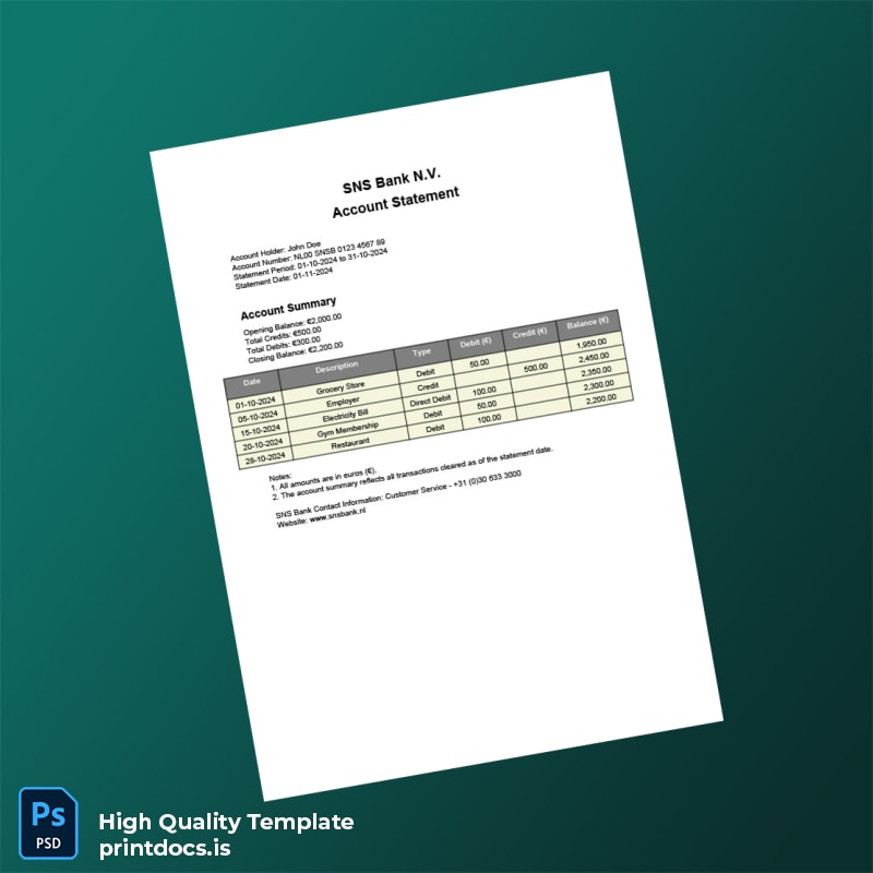 Looking for a reliable and professional solution to your banking documentation needs? Our Netherlands SNS Bank Statement Template is designed to help you create accurate and credible bank statements quickly and efficiently, providing you peace of mind whether for personal use or professional applications.