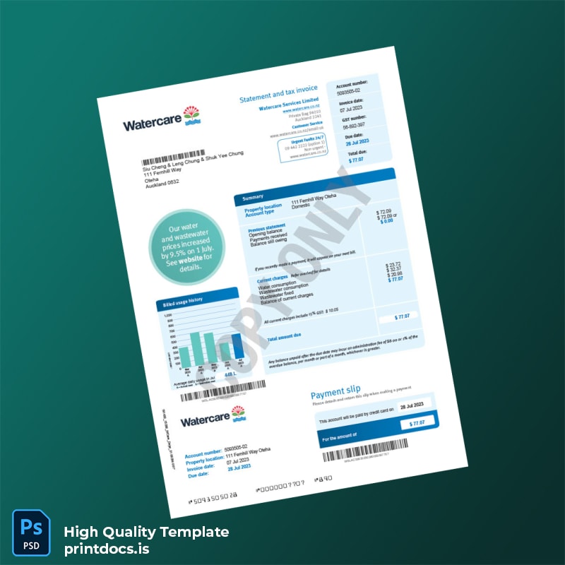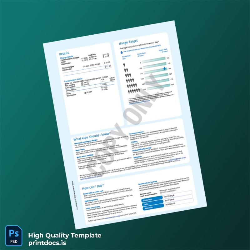 New Zealand Watercare Services Editable Water Bill Template: Professional Utility Bill Proof of Address Solution