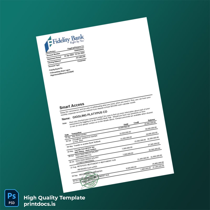 Don’t let the lack of a bank statement stand in your way. Enhance your productivity and professional image by utilizing our Nigeria Fidelity Bank Statement Template. Explore more options and give yourself the peace of mind that comes with having all your financial documents ready in an instant.