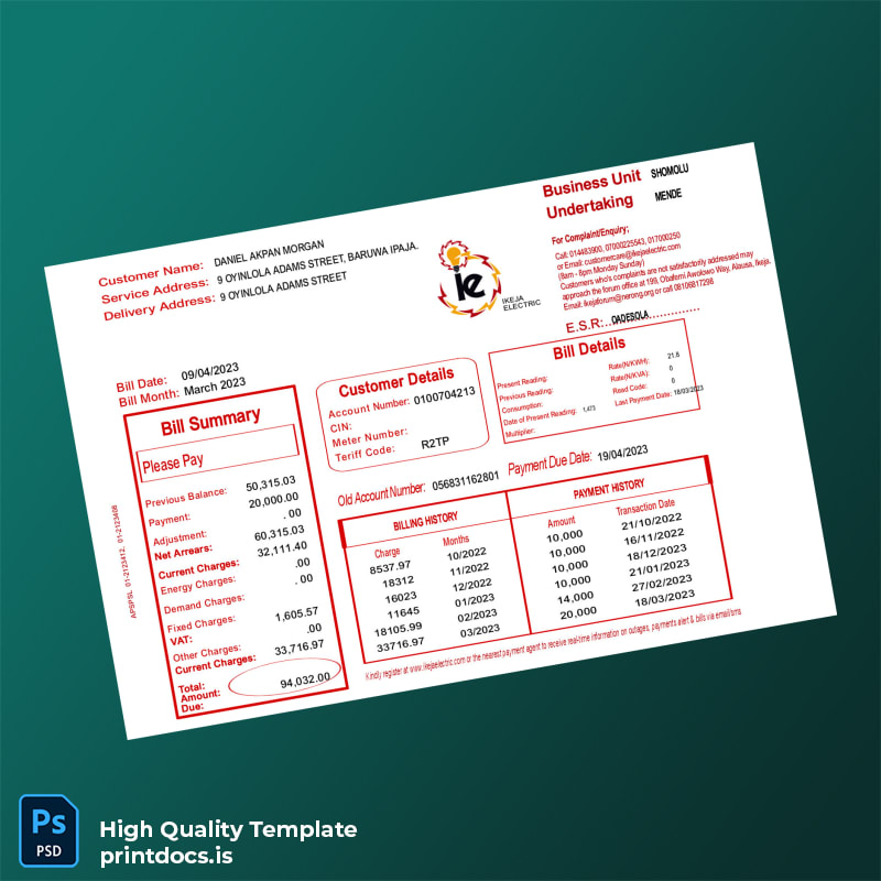 Nigeria Ikeja Electric Editable Utility Bill Template in Word and PDF Formats