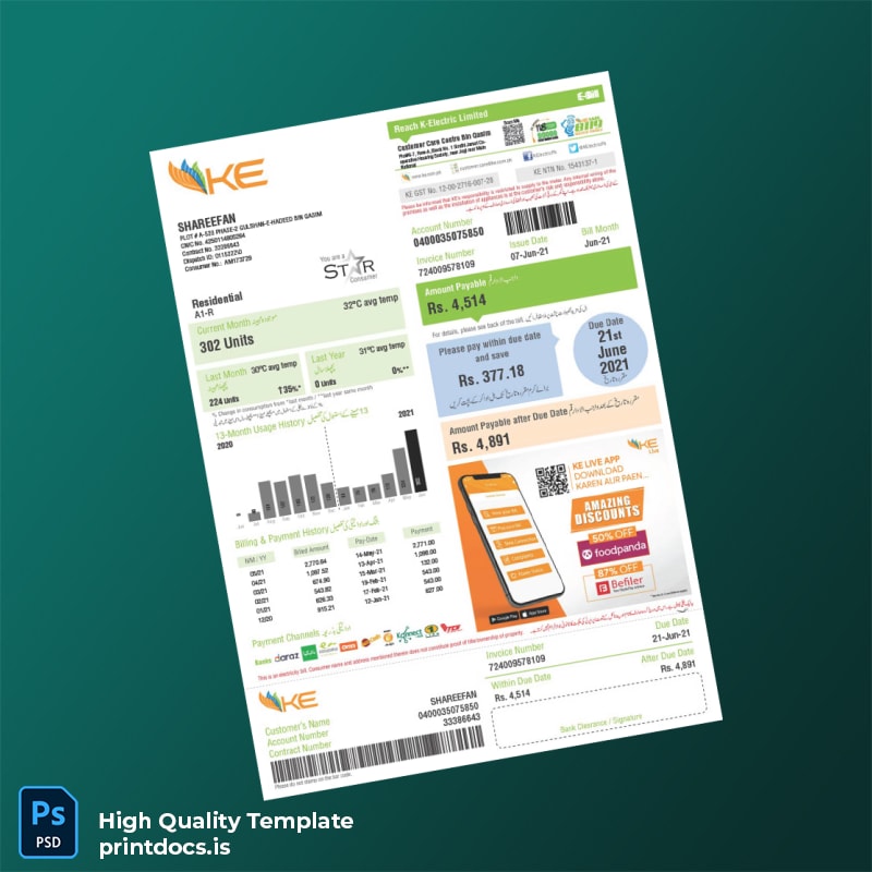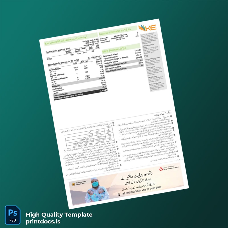 Authentically crafted layout reflecting official Pakistan K-Electric bills, ensuring your document matches the original format precisely.