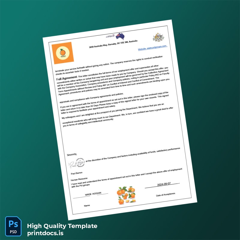 Australia AUS GROUPS Employment Verification Letter Template (Word & PDF)