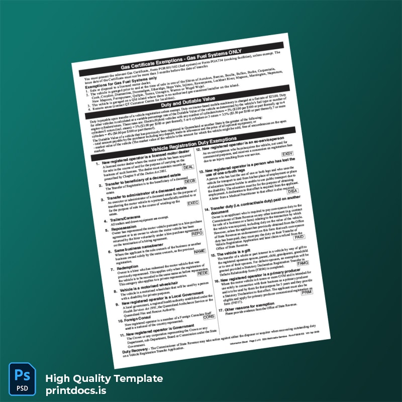 • Complies with Queensland Department of Transport and Main Roads standards for vehicle registration transfers.